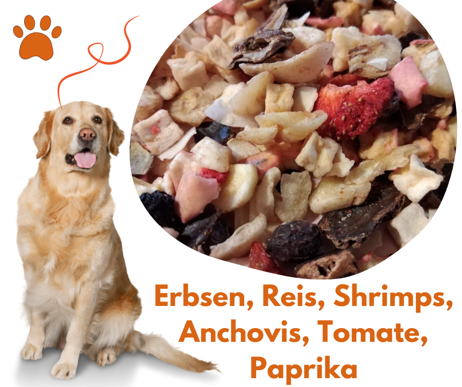 Zusammensetzung: Erbsen, Reis, Shrimps (10%), Anchovis (10%), Tomate, Paprika